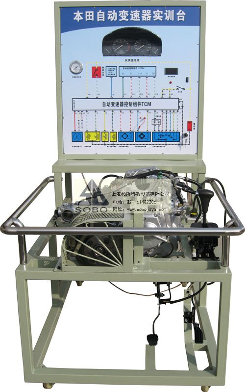本自動變速器實訓臺是本公司采用日本本田公司自動變速器為適應汽車教學需求而研制的,該實訓臺由電控變速器(八成新)、操作顯示面板及發動機彩色電氣原理圖電腦控制柜、可移動式臺架(萬向腳輪)、驅動系統(腳踏式油門踏板)變頻電機驅動、剎車系統(腳踏液壓盤試剎車)、啟動系統(電門鎖方式啟動)、車速傳感器、電磁閥執行器、原車電腦、具有發動機運轉及顯示(轉速.車速.檔位)、液壓油壓力顯示表(顯示換檔過程油壓)、自動變速器電磁閥工作指示LED燈、原車診斷座、進行失速實驗等、故障設置區可設置8路故障(老師設置任一路線路故障)、故障排除區(學生通過各種儀器、儀表、)在面板上用專用排故線連接排除故障、傳感器信號模擬等多項功能、具結構緊湊、操作方便、安全可靠、教學直觀、是汽車自動變速器實物教學不可缺少的實驗室設備之一。