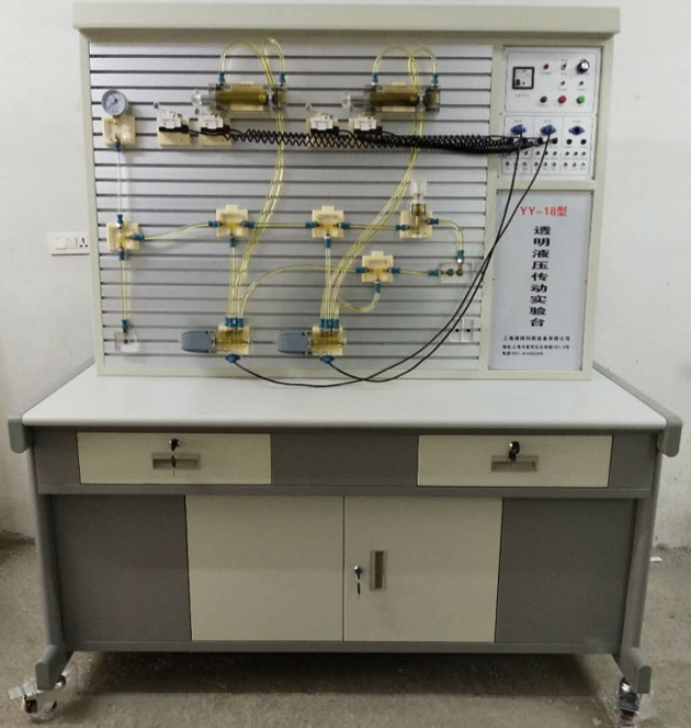 透明液壓PLC控制實訓裝置主要由實訓桌及實訓臺、透明液壓元件和電氣控制器件。可編程器(PLC)組件等組成。
