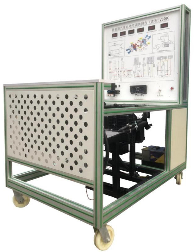 點火開關、電動汽車空調壓縮機、膨脹閥總成、干燥器總成、鼓風機總成、冷凝器、冷卻電子風扇、電動空調壓縮機控制器總成、空調蒸發箱總成、充電器與充電接口、充電插線、DC-DC轉換器、鋰電池組、空調操作面板、高低壓空調壓力表、采暖模塊總成、電源總開關、急停開關、直流接觸器、輔助蓄電池(12V45AH)、一體化全鋁合金型材搭建的移動臺架(1500×1000×1700mm ,帶自鎖腳輪裝置,帶安裝檢測端子的原理面板948×898mm)、故障模擬與排除裝置、設備操作說明書。