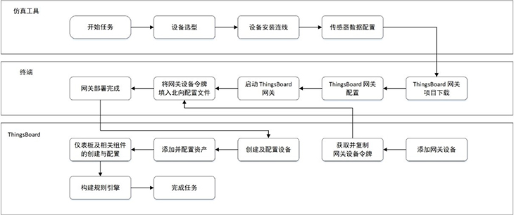 智慧溫室案例,引入了ThingsBoard IoT Gateway開源解決方案,在AIoT平臺的仿真工具中部署ThingsBoard gateway網關,以連接ThingsBoard云平臺,便于上送溫濕度傳感器數據,搭建恒溫機執行器模塊;ThingsBoard平臺,用戶可在儀表盤內添加設置智慧溫室場景、溫濕度顯示設備等組件,獲取仿真實驗中上送的虛擬數據,以動態曲線的形式作可視化呈現;用戶還可根據案例要求,在ThingsBoard平臺的規則鏈庫中,自主編輯設定規則引擎,實現智慧溫室的恒溫控制與異常告警。