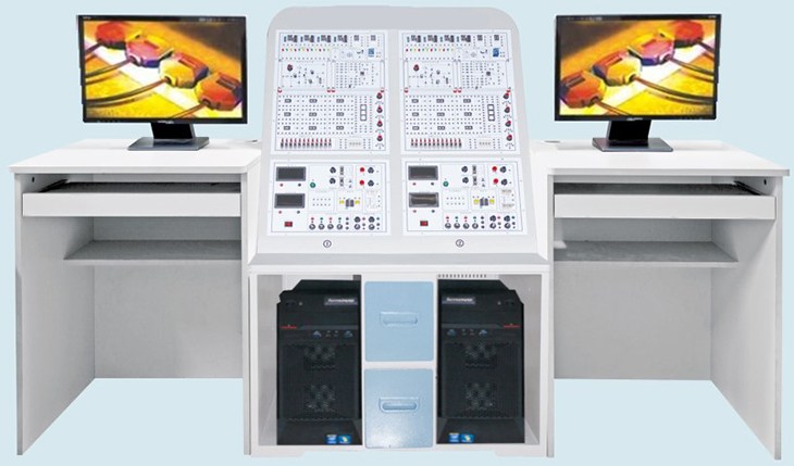 雙工位同步教學平臺:尺寸:800×600×1200mm 材質(zhì):ABS 厚度5毫米,平臺后部采用透明有機玻璃;平臺下端兩側(cè)擺放電腦主機,主機中間另有兩個抽屜存放實驗器材,平臺上部擺放2個工位的數(shù)/模電同步互動教學系統(tǒng)硬件模塊。 |