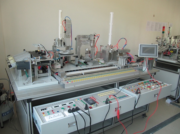 自動化綜合實訓裝置臺架為鋁合金導軌式,實訓考核裝置PLC模塊的I/O 端子、變頻器的接線端子、各常用模塊與PLC的連接端子,均與安全插座連接,使用帶安全插頭的導線進行電路連接;各指令開關、光電開關、傳感器和指示元件的電路,則通過端子排進行連接。插拔線連接電路與端子牌連接電路相結合,既保證學生基本技能的訓練、形成和鞏固,又保證電路連接的快速、安全和可靠。